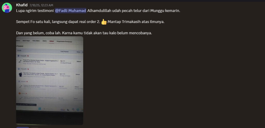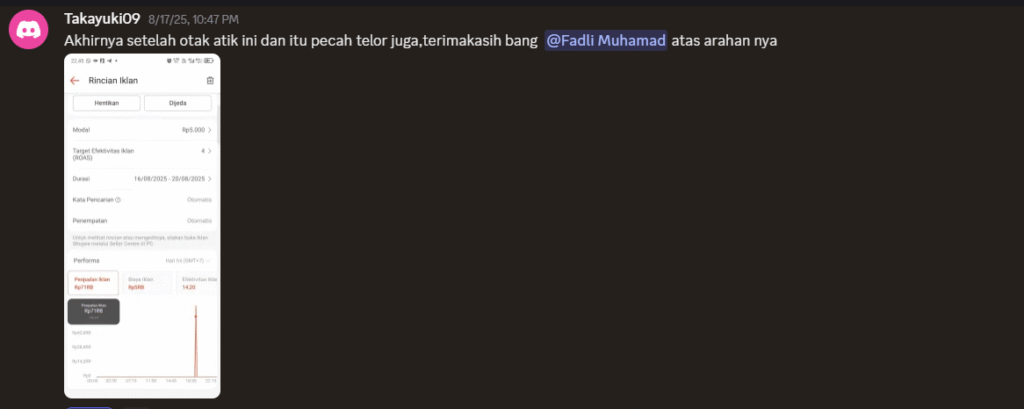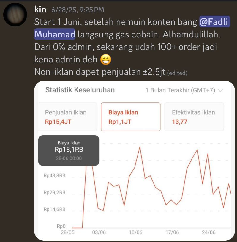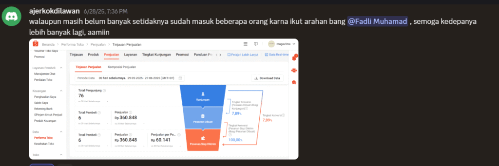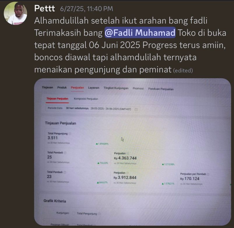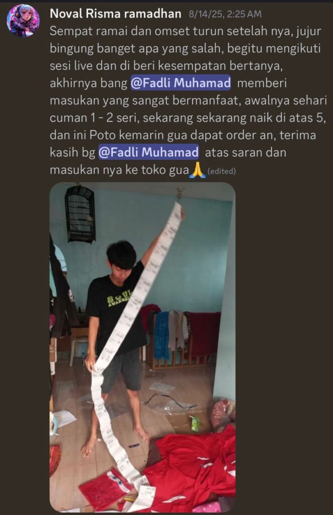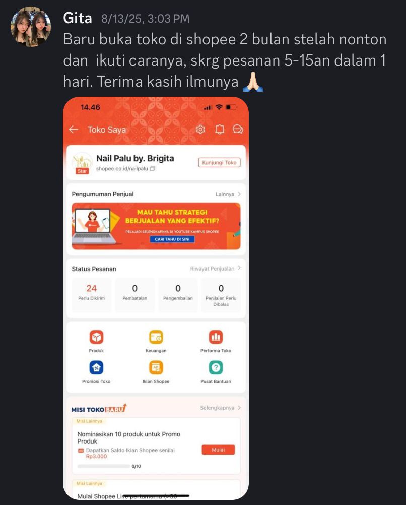 Lu akan mendapatkan fasilitas bimbingan mentoring mingguan dengan Fadli Muhamad. Pada sesi ini, Lu bisa bertanya seputar kendala jualan di shopee dan juga bisa langsung bedah toko.